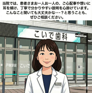 こいで歯科では、コミュニケーションを大切にします。患者さまお一人お一人の、事情や状況をよくお聞きして、診療を進めてまいります。心配なことがございましたら、いつでもお気軽にご相談ください。